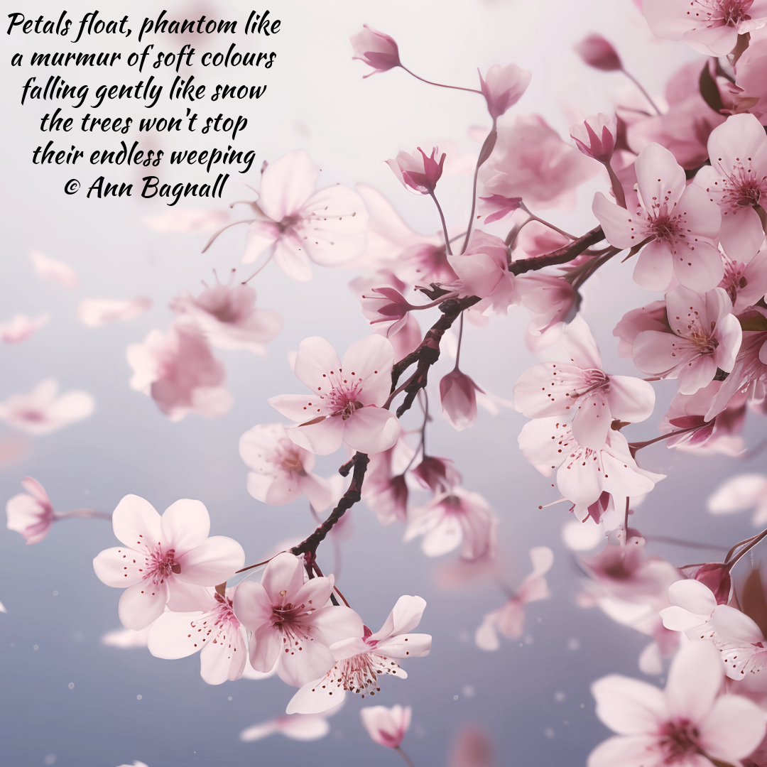 April 8, 2026March 8, 2026 Petals float, phantom like a murmur of soft colours falling gently like snow the trees won’t stop their endless weeping © Ann Bagnall Share this: Email a link to a friend (Opens in new window) Email Tweet Print (Opens in new window) Print Like Loading... Related
