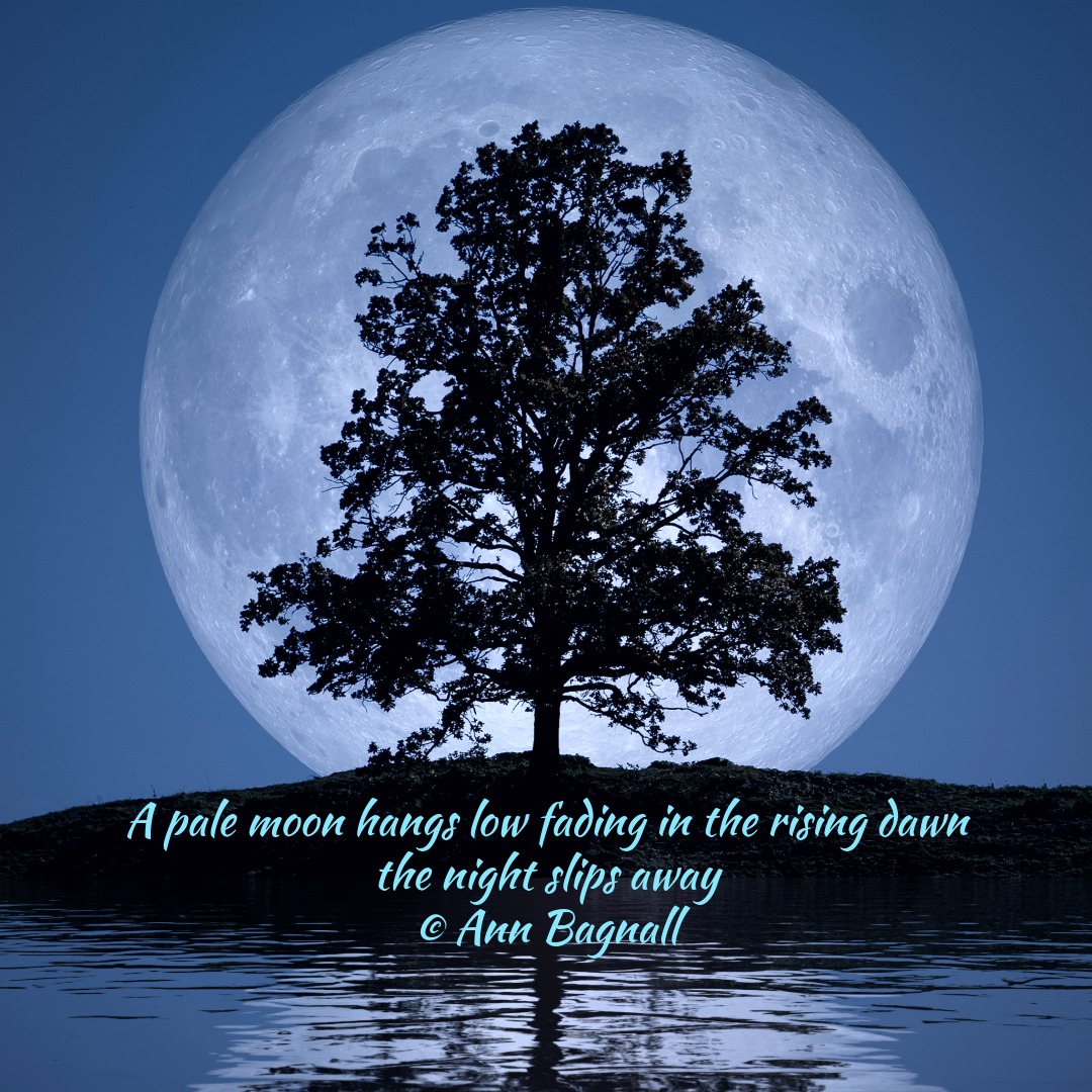 April 22, 2026March 8, 2026 A pale moon hangs low fading in the rising dawn the night slips away © Ann Bagnall Share this: Email a link to a friend (Opens in new window) Email Tweet Print (Opens in new window) Print Like Loading... Related